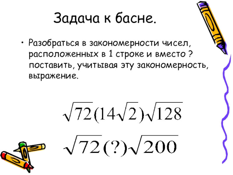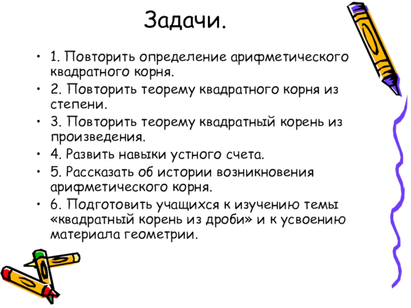 Задачи.1. Повторить определение арифметического квадратного корня.2. Повторить теорему квадратного корня из степени.3. Повторить теорему квадратный корень из