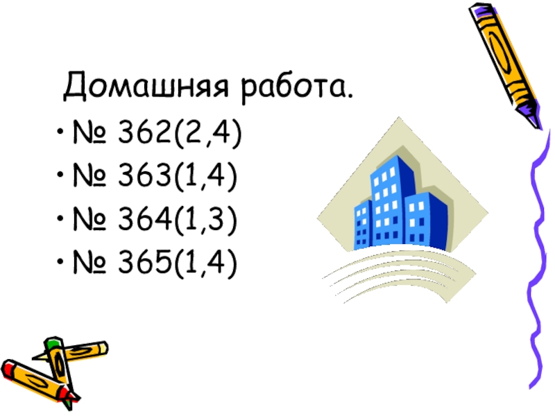 Домашняя работа.№ 362(2,4)№ 363(1,4)№ 364(1,3)№ 365(1,4)