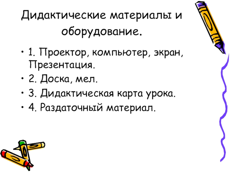 Дидактические материалы и оборудование.1. Проектор, компьютер, экран, Презентация.2. Доска, мел.3. Дидактическая карта урока.4. Раздаточный материал.