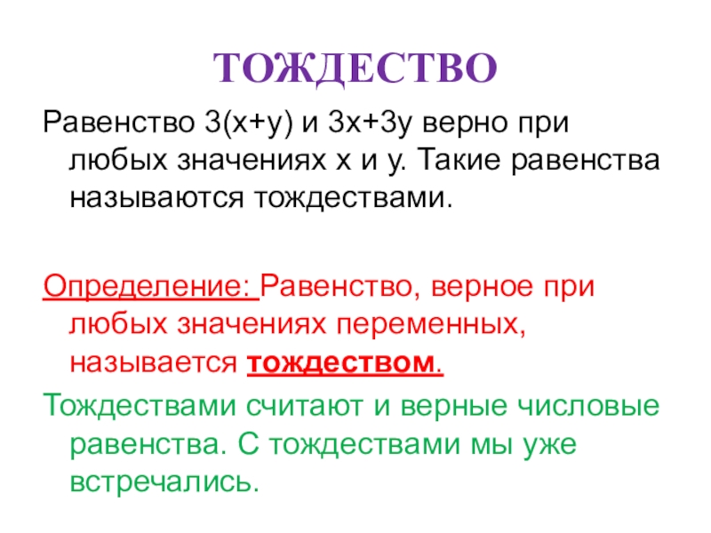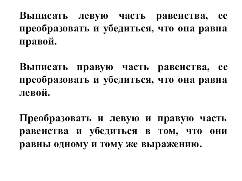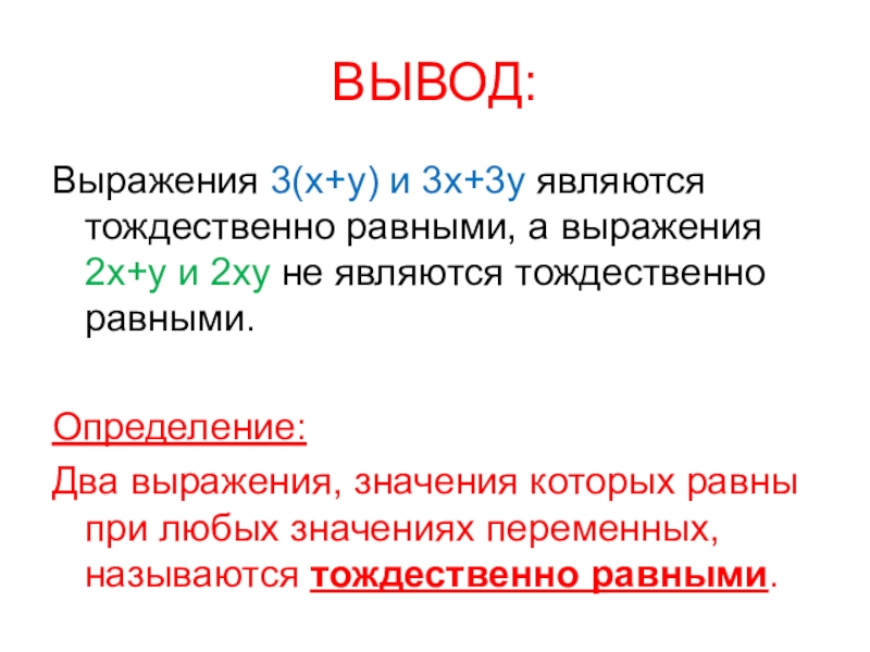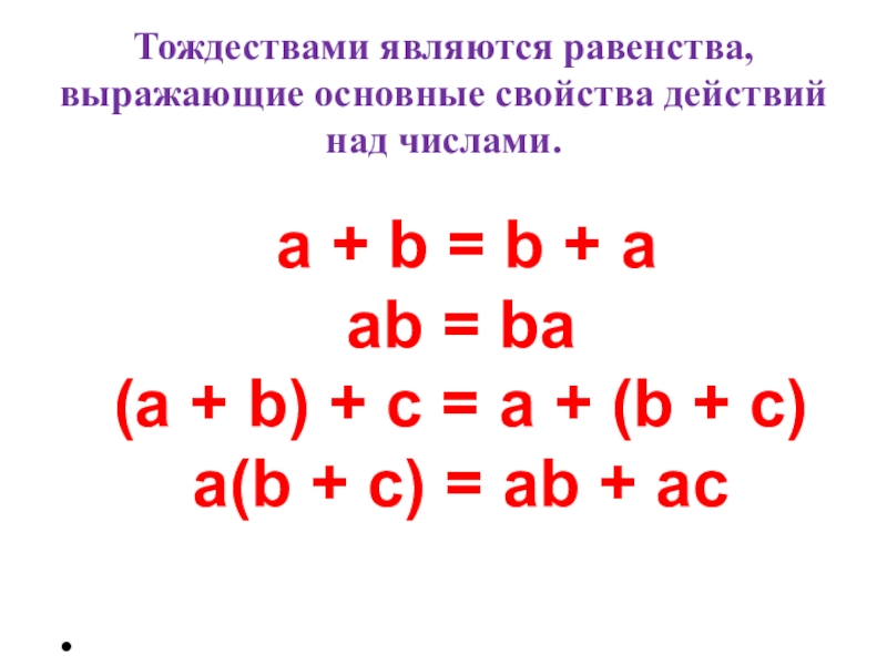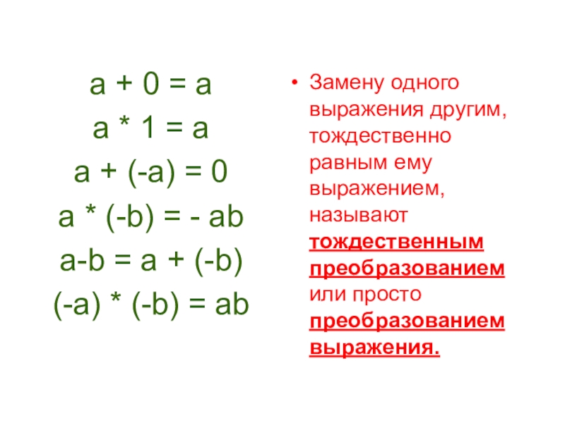 Замену одного выражения другим, тождественно равным ему выражением, называют тождественным преобразованием или просто преобразованием выражения.