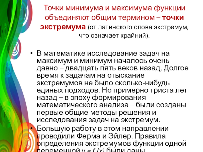 Большую работу в этом направлении проводили Ферма и Эйлер. Правила определения экстремумов функции одной переменной y = f (x) были даны Маклореном.