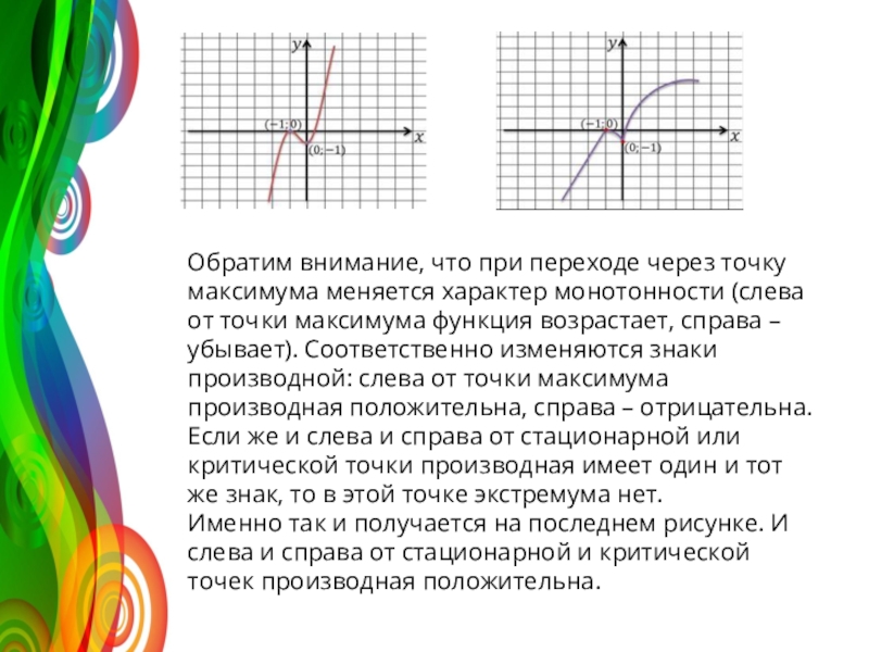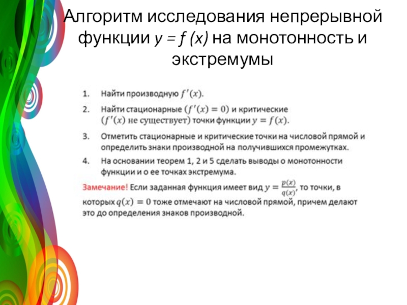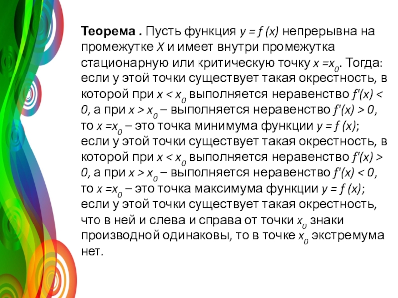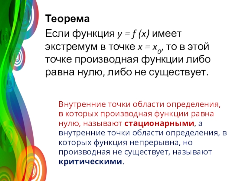 Внутренние точки области определения, в которых производная функции равна нулю, называют стационарными, а внутренние точки области определения, в которых функция непрерывна, но производная не существует, называют критическими.