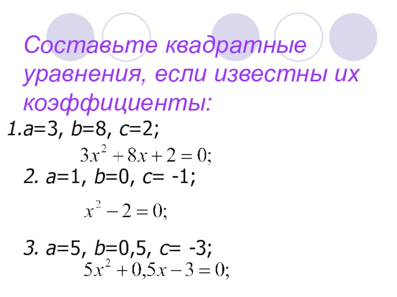 Составьте квадратные уравнения, если известны их коэффициенты:а=3, b=8, c=2;2. а=1, b=0, c= -1;3. а=5, b=0,5, c= -3;