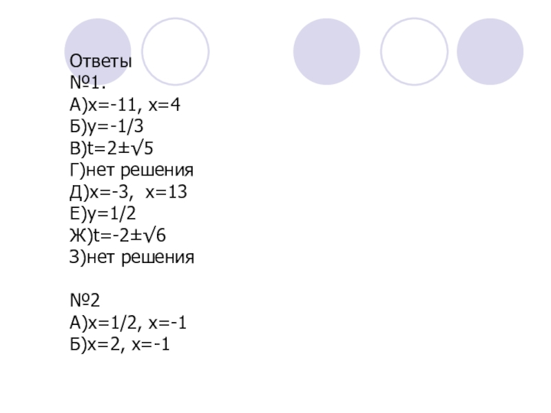 Ответы№1.А)х=-11, х=4Б)y=-1/3В)t=2±√5Г)нет решенияД)х=-3, х=13Е)у=1/2Ж)t=-2±√6З)нет решения№2А)х=1/2, х=-1Б)х=2, х=-1
