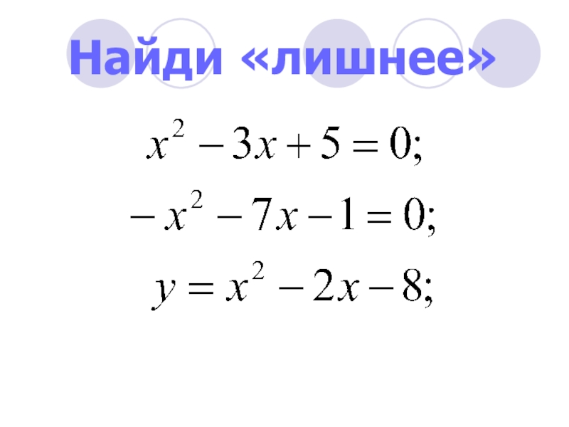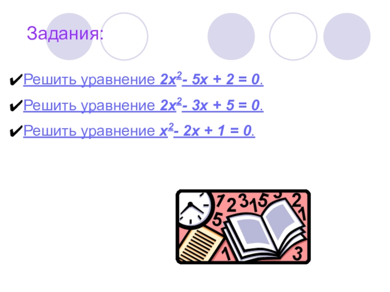 Задания:Решить уравнение 2x2- 5x + 2 = 0.Решить уравнение 2x2- 3x + 5 = 0.Решить уравнение x2- 2x + 1 = 0.