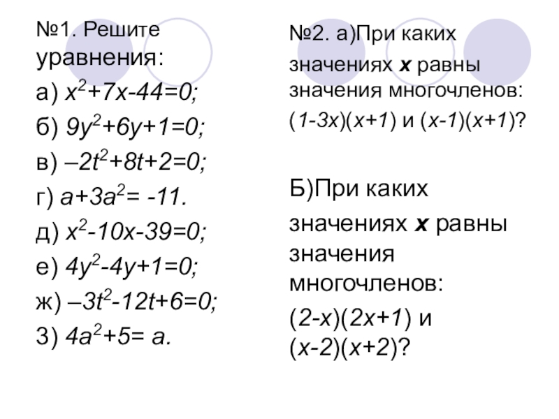 №1. Решите уравнения:а) х2+7х-44=0;б) 9у2+6у+1=0;в) –2t2+8t+2=0;г) а+3а2= -11.д) х2-10х-39=0;е) 4у2-4у+1=0;ж) –3t2-12t+6=0;3) 4а2+5= а.№2. а)При какихзначениях х равны