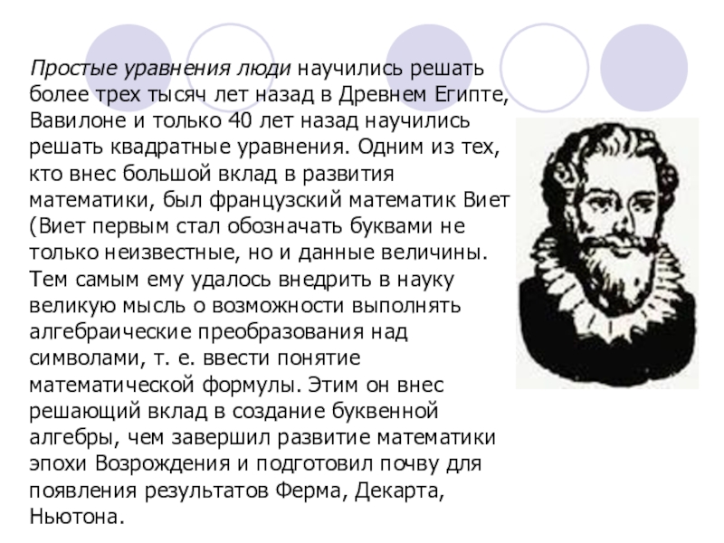 Древнем Египте, Вавилоне и только 40 лет назад научились решать квадратные уравнения. Одним из тех, кто внес большой вклад в развития математики, был французский математик Виет (Виет первым стал обозначать буквами не только неизвестные, но и данные величины. Тем самым ему удалось внедрить в науку великую мысль о возможности выполнять алгебраические преобразования над символами, т. е. ввести понятие математической формулы. Этим он внес решающий вклад в создание буквенной алгебры, чем завершил развитие математики эпохи Возрождения и подготовил почву для появления результатов Ферма, Декарта, Ньютона.