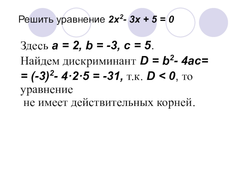 Решить уравнение 2x2- 3x + 5 = 0Здесь a = 2, b = -3, c = 5.Найдем дискриминант D = b2- 4ac== (-3)2- 4·2·5 = -31,