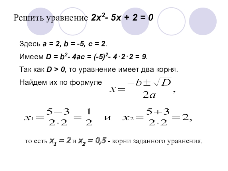 Решить уравнение 2x2- 5x + 2 = 0Здесь a = 2, b = -5, c = 2. Имеем D = b2- 4ac = (-5)2- 4⋅2⋅2 = 9. Так как D > 0, то уравнение имеет два корня.Найдем их