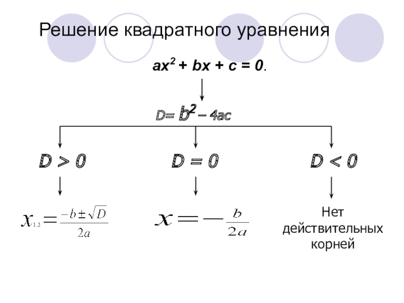 Решение квадратного уравненияах2 + bх + с = 0.D= b2 – 4acD = 0D < 0D >
