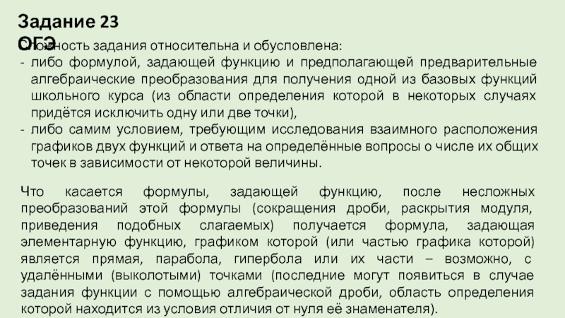 Что касается формулы, задающей функцию, после несложных преобразований этой формулы (сокращения дроби, раскрытия модуля, приведения подобных слагаемых) получается формула, задающая элементарную функцию, графиком которой (или частью графика которой) является прямая, парабола, гипербола или их части – возможно, с удалёнными (выколотыми) точками (последние могут появиться в случае задания функции с помощью алгебраической дроби, область определения которой находится из условия отличия от нуля её знаменателя).