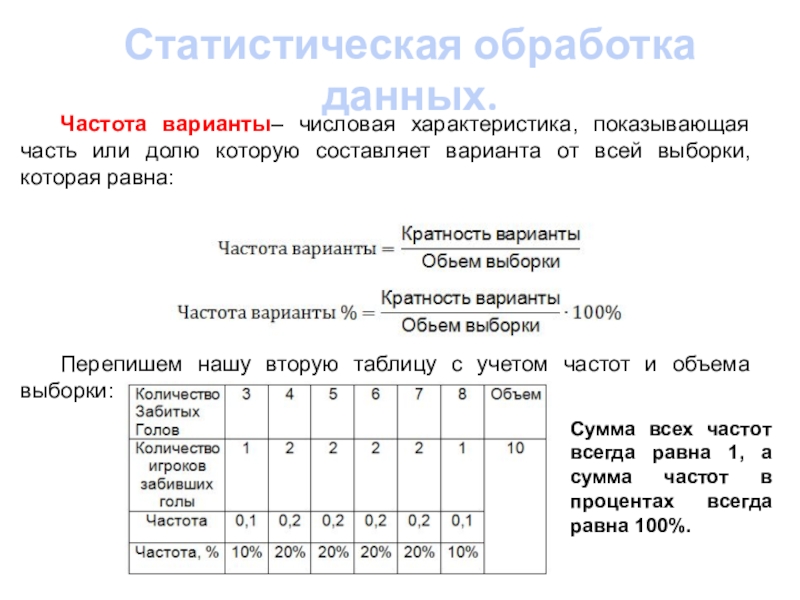 Сумма всех частот всегда равна 1, а сумма частот в процентах всегда равна 100%.