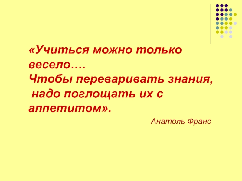 «Учиться можно только весело…. Чтобы переваривать знания, надо поглощать их с аппетитом». Анатоль