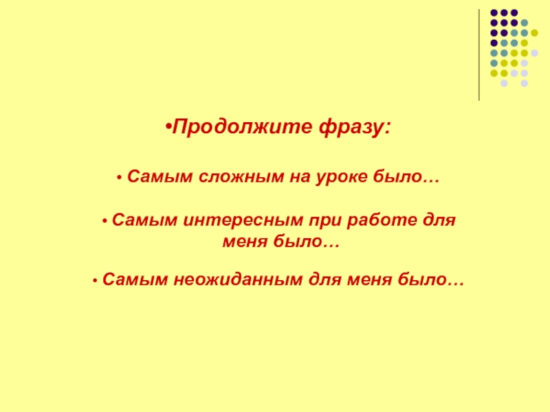 Продолжите фразу: Самым сложным на уроке было… Самым интересным при работе для меня было… Самым неожиданным для