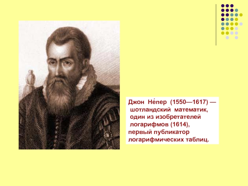 Джон  Не́пер  (1550—1617) — шотландский  математик, один из изобретателей логарифмов (1614), первый публикатор логарифмических таблиц.
