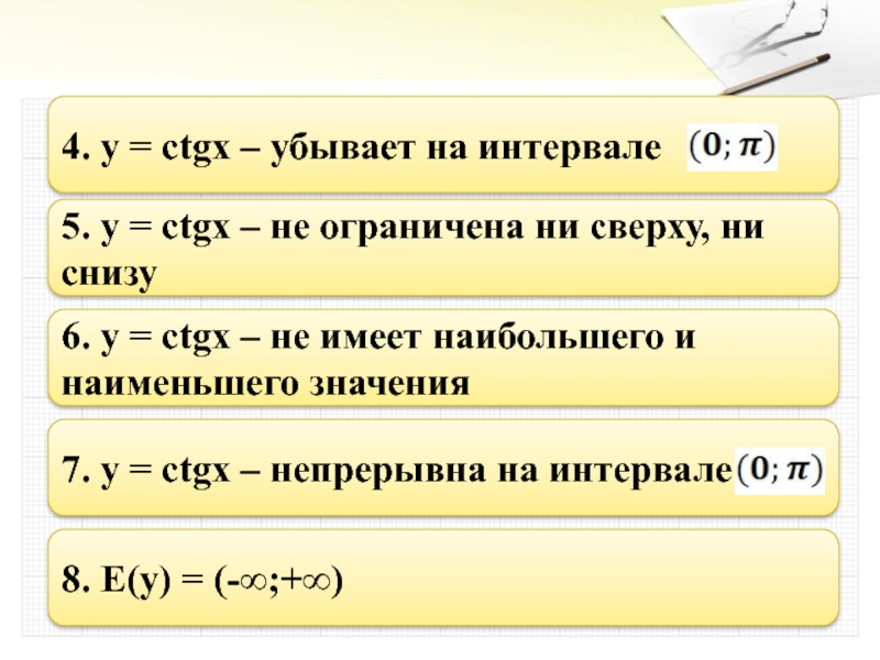 6. y = ctgx – не имеет наибольшего и наименьшего значения