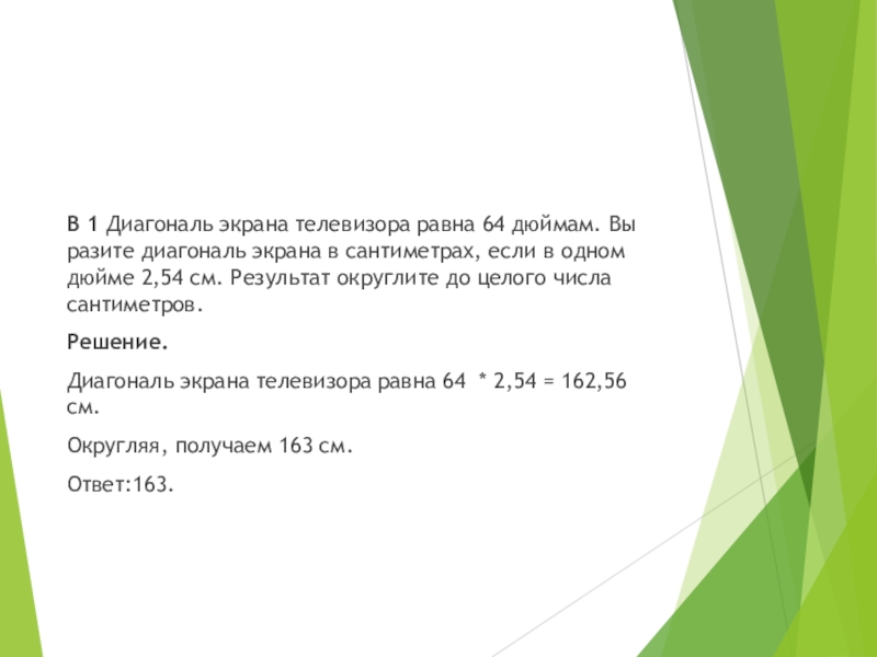 B 1 Диагональ экрана телевизора равна 64 дюймам. Выразите диагональ экрана в сантиметрах,