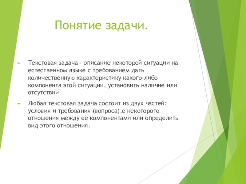Любая текстовая задача состоит из двух частей: условия и требования (вопроса).е некоторого отношения между её компонентами или определить вид этого отношения.