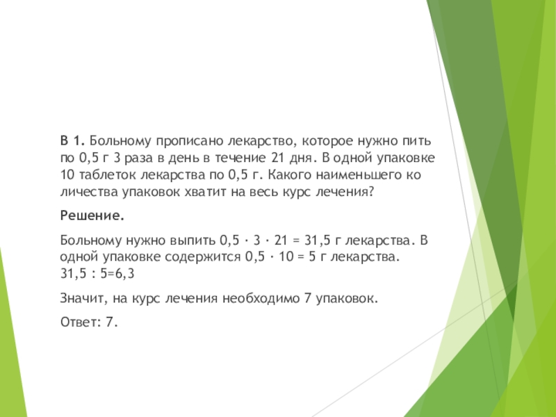 B 1. Больному прописано лекарство, которое нужно пить по 0,5 г 3 раза в