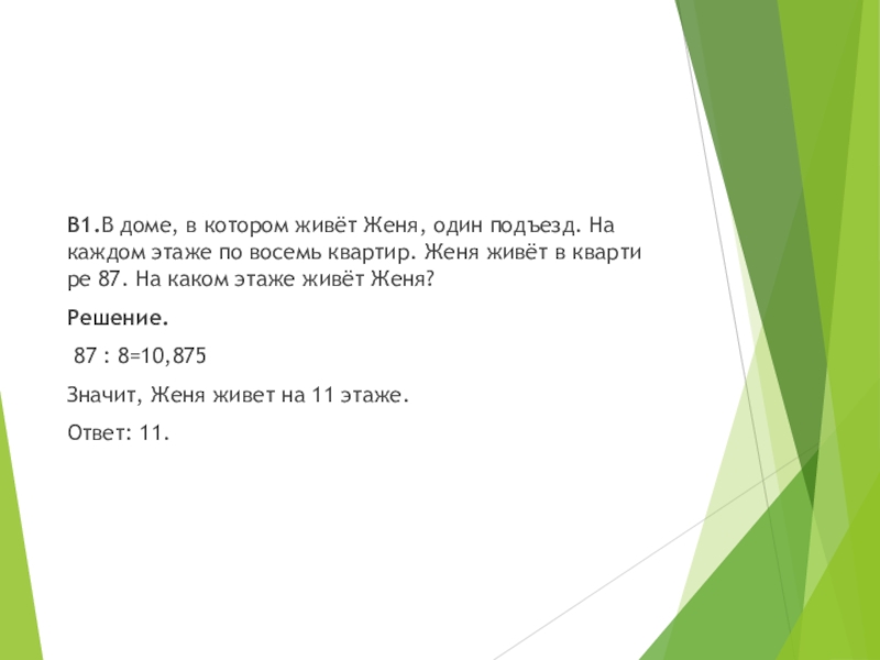по восемь квартир. Женя живёт в квартире 87. На каком этаже живёт Женя?
