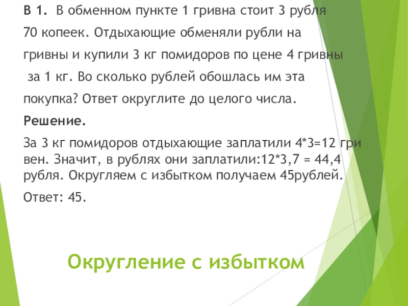 За 3 кг помидоров отдыхающие заплатили 4*3=12 гривен. Значит, в рублях они заплатили:12*3,7 = 44,4 рубля. Округляем с избытком получаем 45рублей.