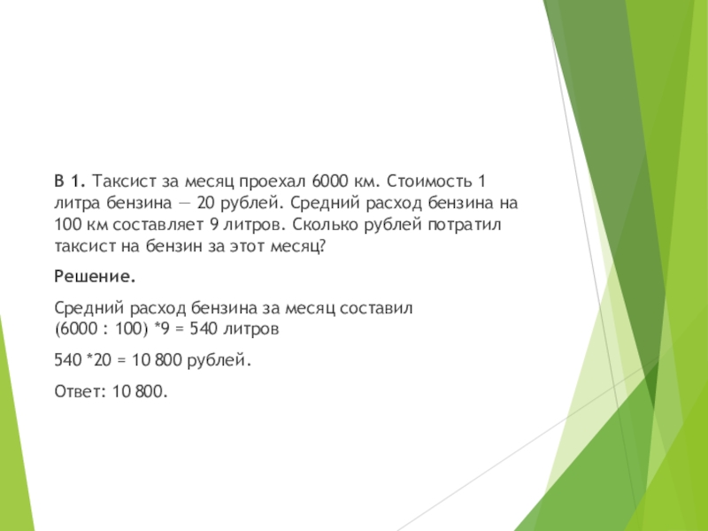 B 1. Таксист за месяц проехал 6000 км. Стоимость 1 литра бензина — 20 рублей.