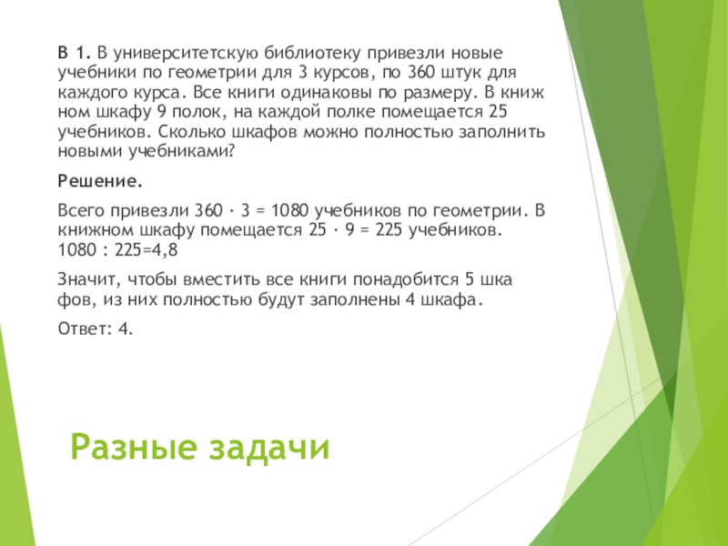 Всего привезли 360 · 3 = 1080 учебников по геометрии. В книжном шкафу помещается 25 · 9 = 225 учебников. 1080 : 225=4,8