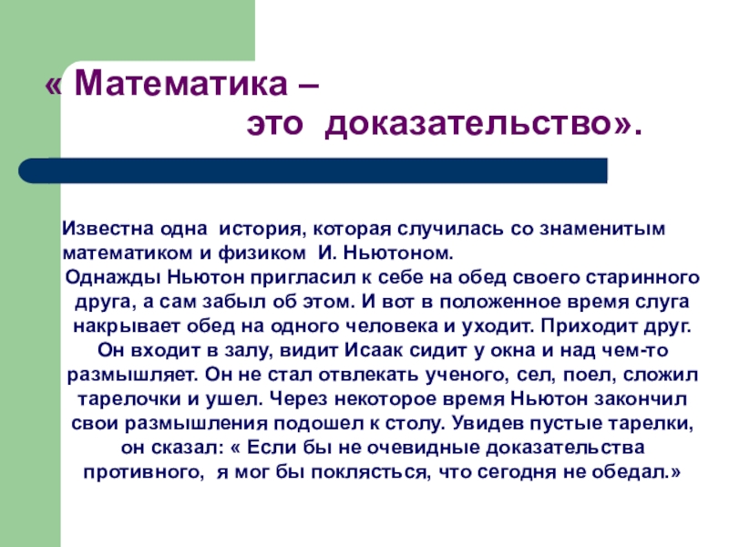 Однажды Ньютон пригласил к себе на обед своего старинного друга, а сам забыл об этом. И вот в положенное время слуга накрывает обед на одного человека и уходит. Приходит друг. Он входит в залу, видит Исаак сидит у окна и над чем-то размышляет. Он не стал отвлекать ученого, сел, поел, сложил тарелочки и ушел. Через некоторое время Ньютон закончил свои размышления подошел к столу. Увидев пустые тарелки, он сказал: « Если бы не очевидные доказательства противного, я мог бы поклясться, что сегодня не обедал.»