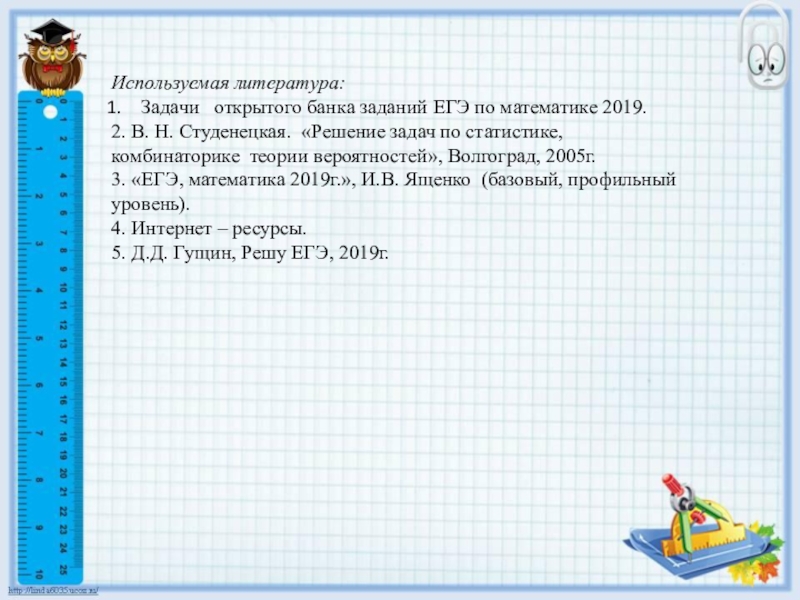Н. Студенецкая. «Решение задач по статистике, комбинаторике теории вероятностей», Волгоград, 2005г.