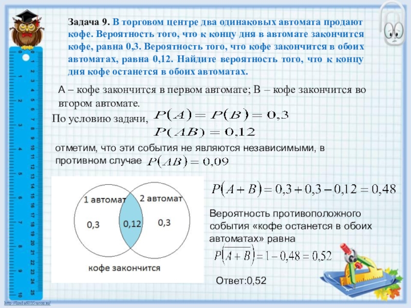 Слайд 11Задача 9. В торговом центре два одинаковых автомата продают кофе. Вероятность