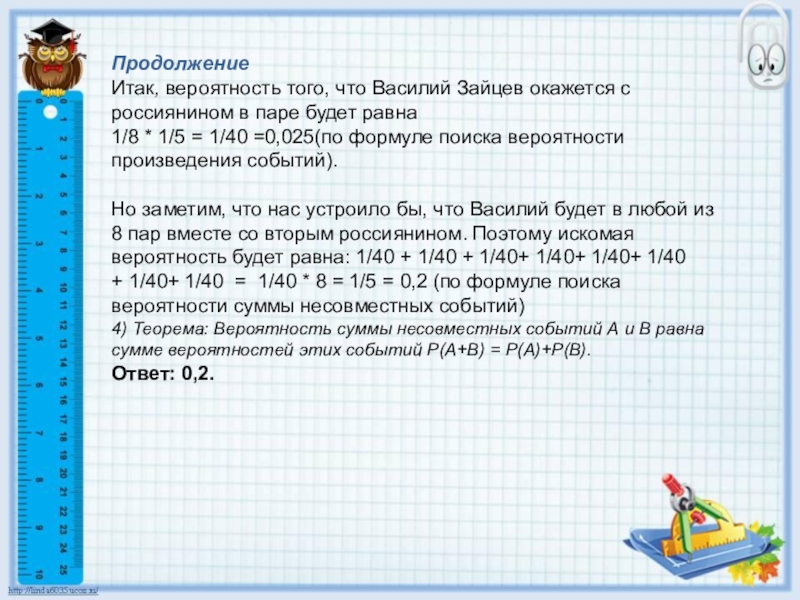 Но заметим, что нас устроило бы, что Василий будет в любой из 8 пар вместе со вторым россиянином. Поэтому искомая вероятность будет равна: 1/40 + 1/40 + 1/40+ 1/40+ 1/40+ 1/40 + 1/40+ 1/40 = 1/40 * 8 = 1/5 = 0,2 (по формуле поиска вероятности суммы несовместных событий)