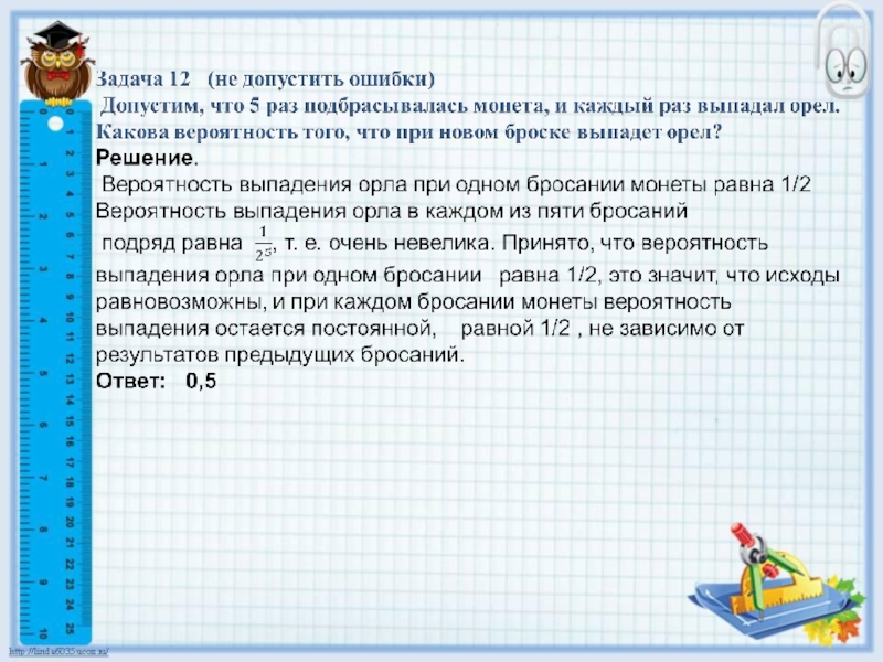 Слайд 8Задача 6. В случайном эксперименте симметричную монету бросают трижды. Найдите вероятность
