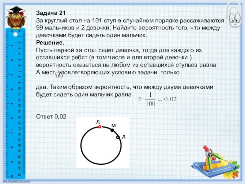 Пусть первой за стол сядет девочка, тогда для каждого из оставшихся ребят (в том числе и для второй девочки ) вероятность оказаться на любом из оставшихся стульев равна А мест, удовлетворяющих условию задачи, только