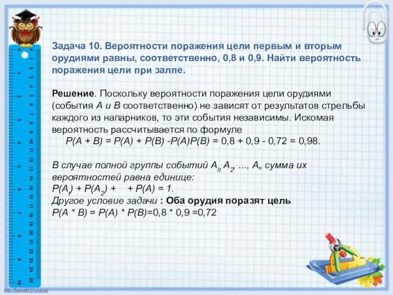 Слайд 12Задача 10. Вероятности поражения цели первым и вторым орудиями равны, соответственно,