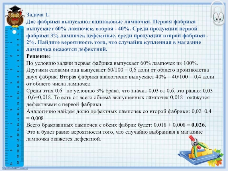 По условию задачи первая фабрика выпускает 60% лампочек из 100%. Другими словами она выпускает 60/100 = 0,6 доли от общего производства двух фабрик. Вторая фабрика аналогично выпускает 40% = 40/100 = 0,4 доли от общего числа лампочек.