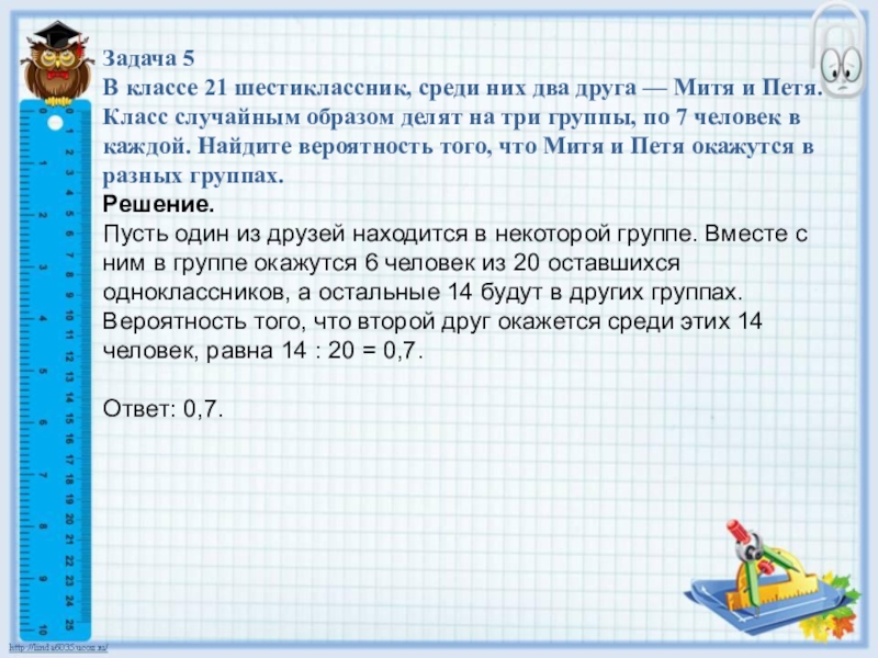 Пусть один из друзей находится в некоторой группе. Вместе с ним в группе окажутся 6 человек из 20 оставшихся одноклассников, а остальные 14 будут в других группах. Вероятность того, что второй друг окажется среди этих 14 человек, равна 14 : 20 = 0,7.
