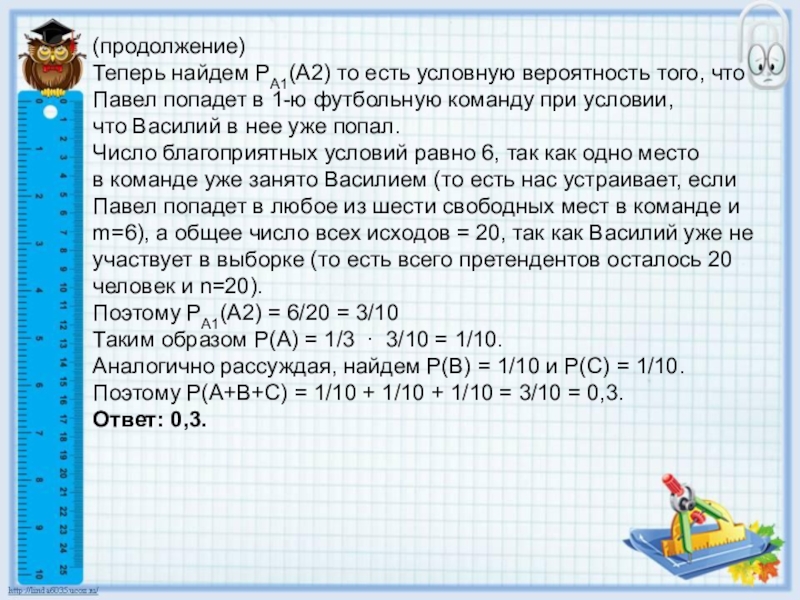 Таким образом Р(А) = 1/3 ∙ 3/10 = 1/10.