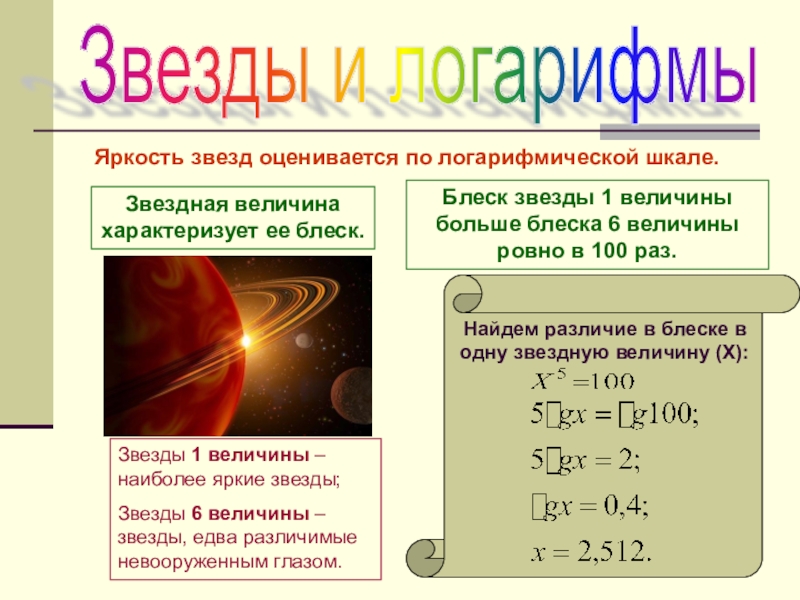 Блеск звезды 1 величины больше блеска 6 величины ровно в 100 раз.
