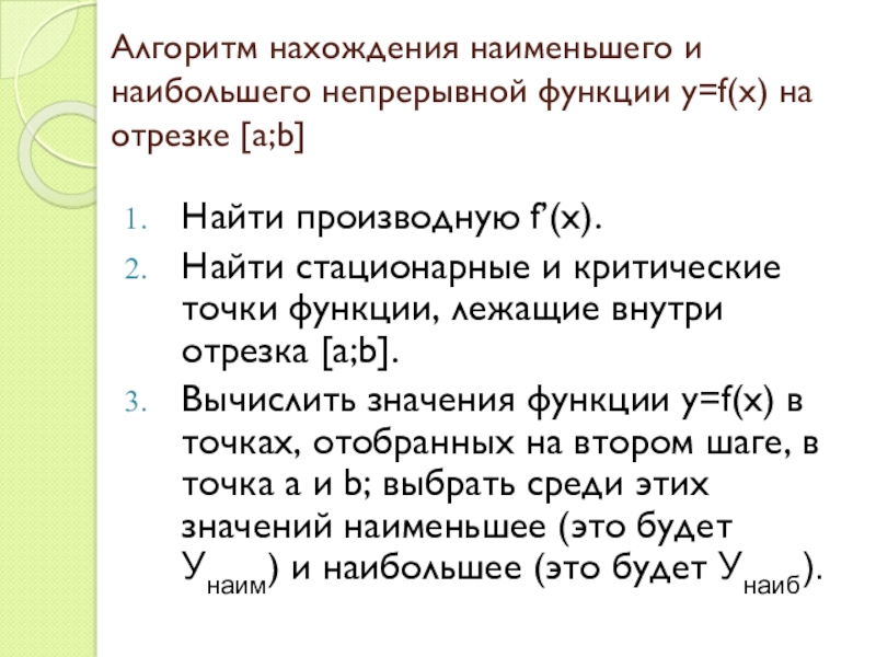 Вычислить значения функции y=f(x) в точках, отобранных на втором шаге, в точка a и b; выбрать среди этих значений наименьшее (это будет Унаим) и наибольшее (это будет Унаиб).