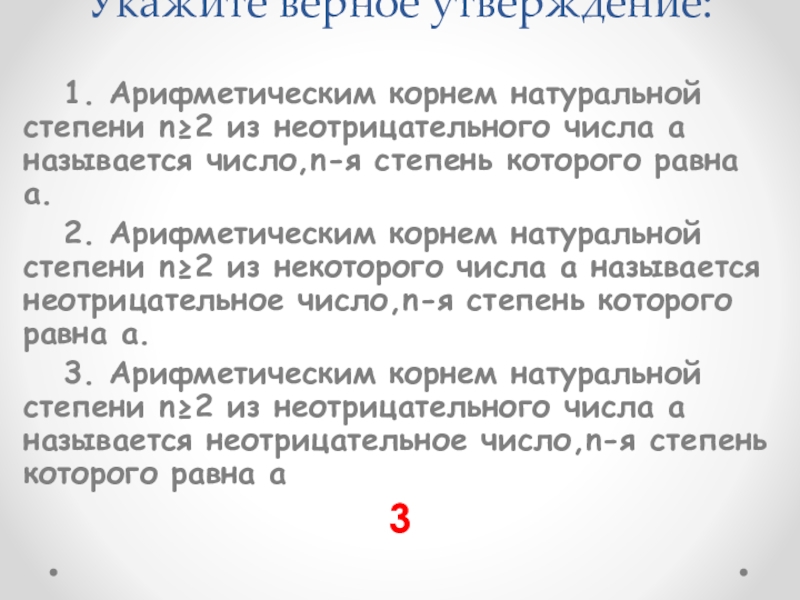 Укажите верное утверждение: 1. Арифметическим корнем натуральной степени n≥2 из неотрицательного числа a называется число,n-я степень которого равна а. 2. Арифметическим корнем натуральной степени n≥2 из некоторого числа a называется неотрицательное число,n-я степень которого равна а. 3. Арифметическим корнем