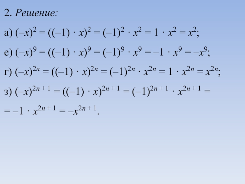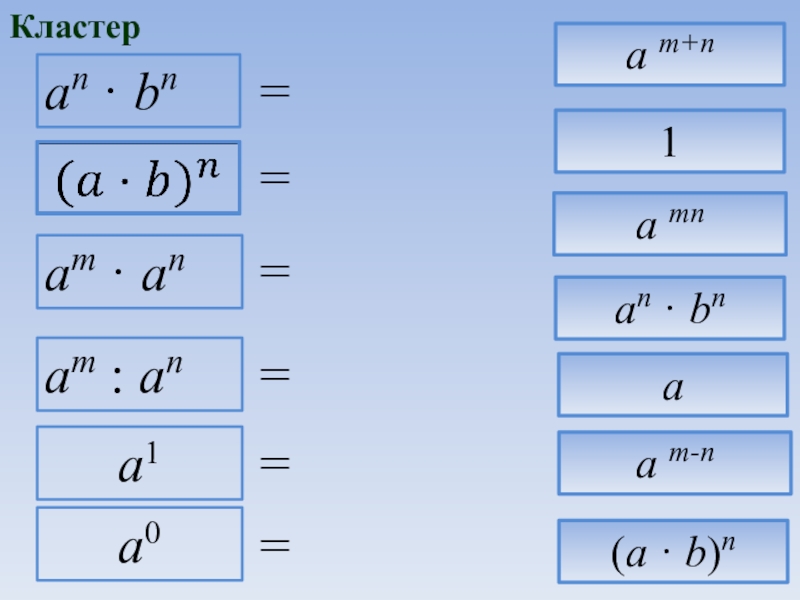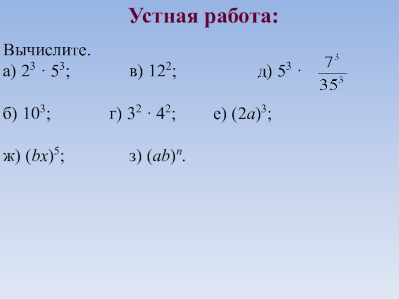 (ab) · (ab) · ... · (ab) = (aa...a)(bb...b) по свойствам умножения п раз п раз; (ab)n = anbn.