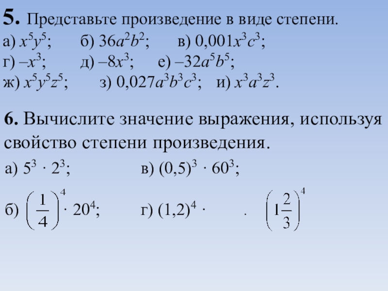 6. Вычислите значение выражения, используя свойство степени произведения.