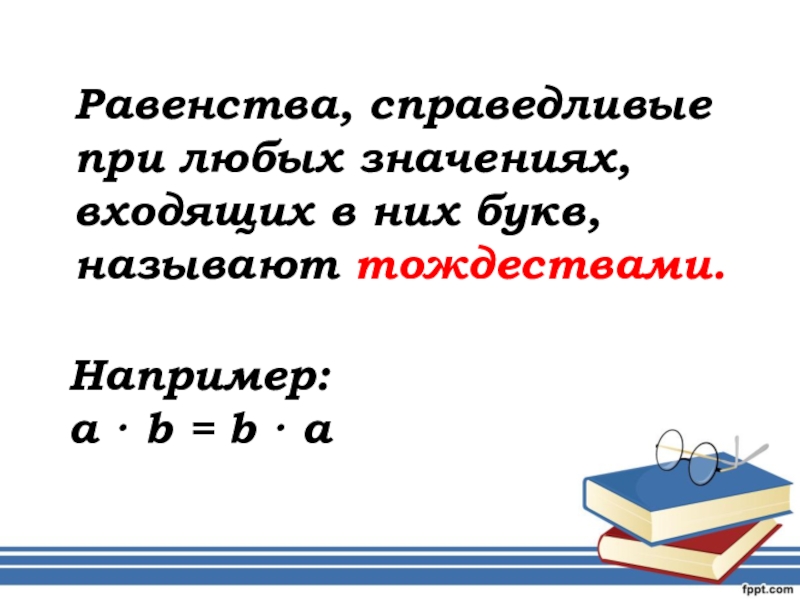 Равенства, справедливыепри любых значениях, входящих в них букв,называют тождествами.Например:а · b = b · a