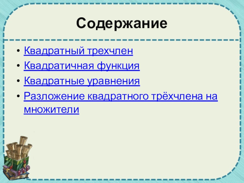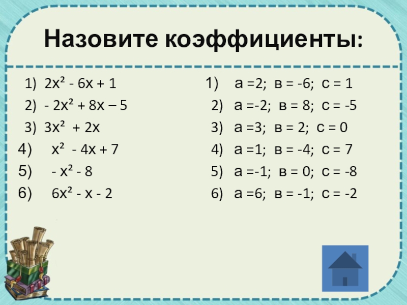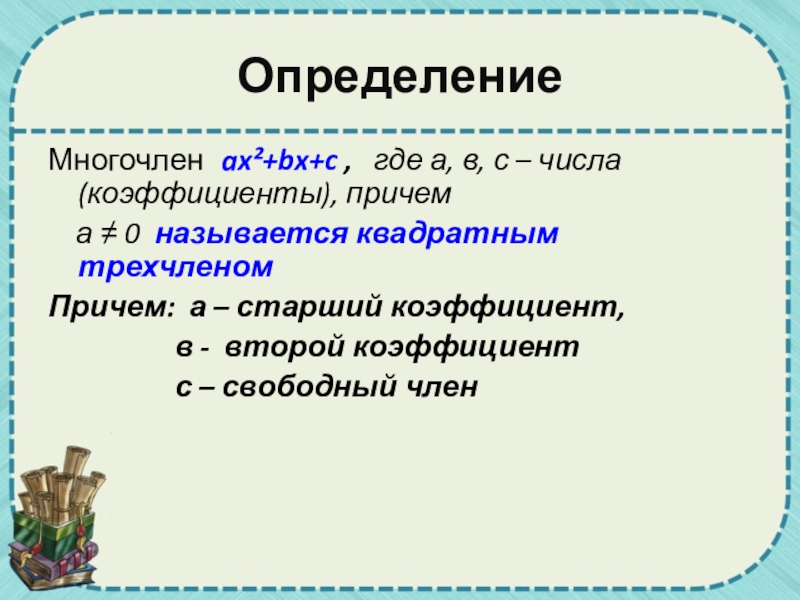 Многочлен ax²+bx+c , где а, в, с – числа (коэффициенты),