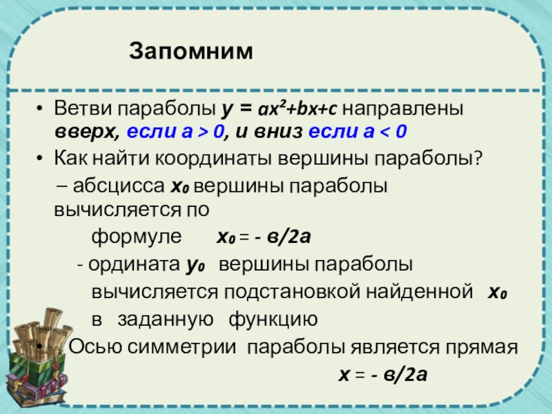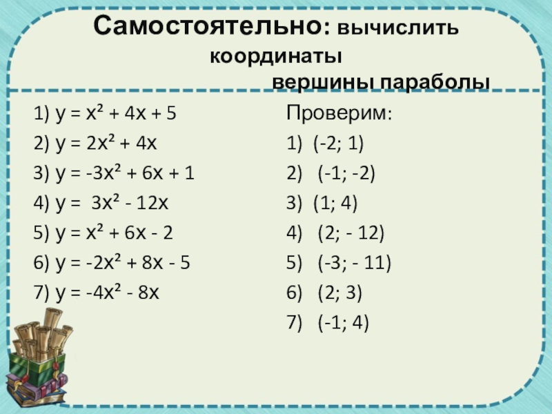 Слайд 9Найти координаты вершины параболы, её ось симметрии и построить её: