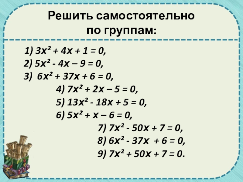 = 0, 2) 5х² - 4х – 9 = 0, 3) 6х² + 37х + 6 = 0,