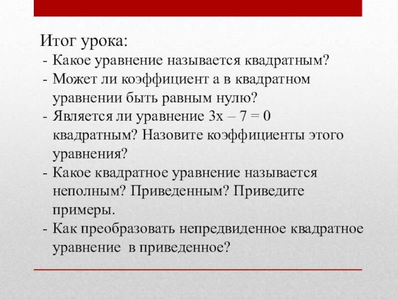 Итог урока:Какое уравнение называется квадратным?Может ли коэффициент а в квадратном уравнении быть равным нулю?Является ли уравнение 3х