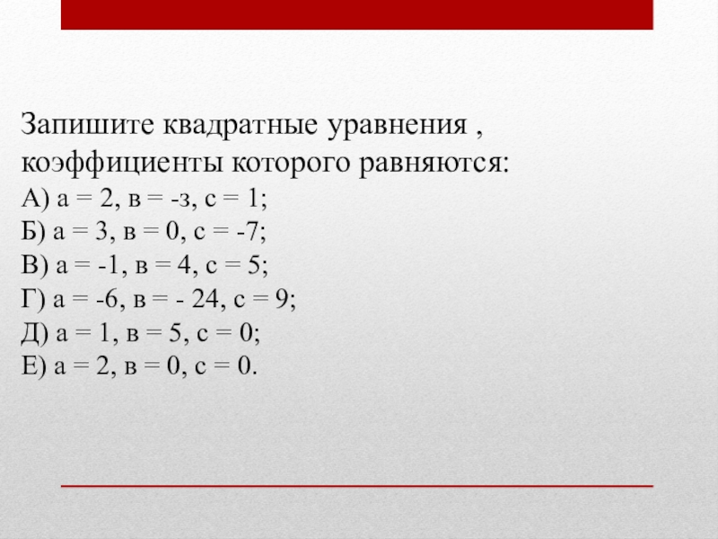 Слайд 13Запишите квадратные уравнения , коэффициенты которого равняются: