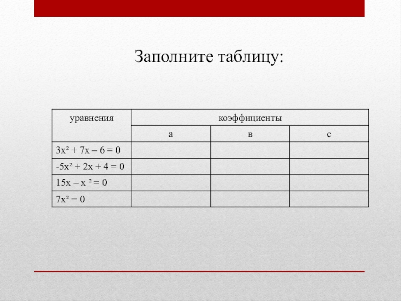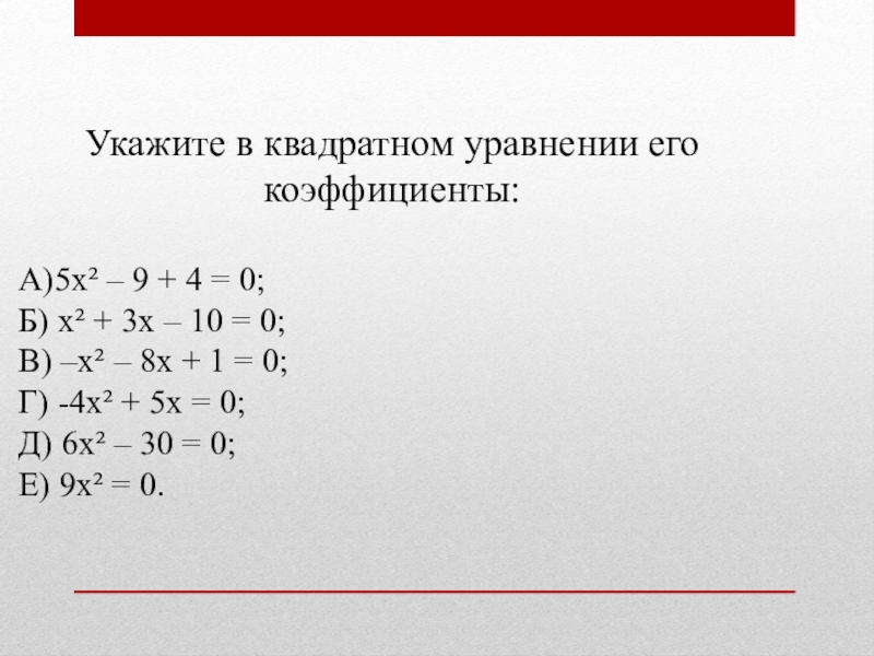 Слайд 12Укажите в квадратном уравнении его коэффициенты: