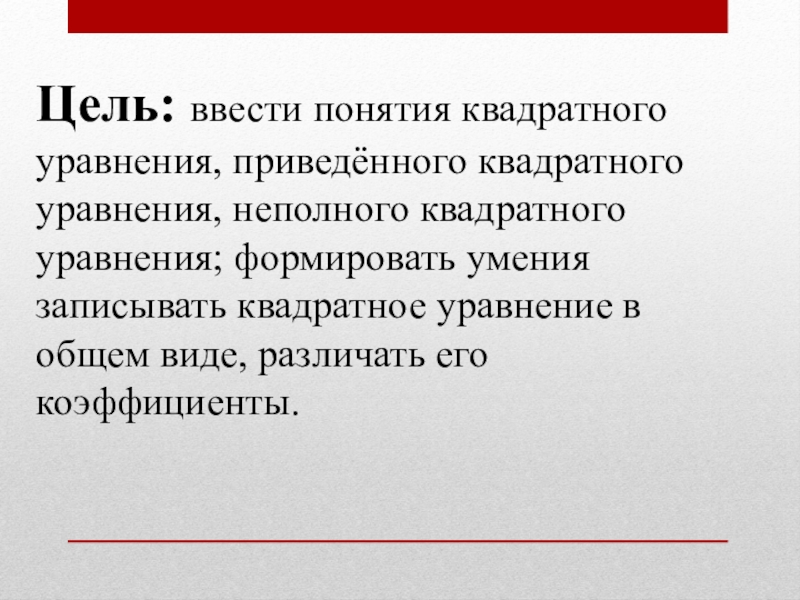 Слайд 2Цель: ввести понятия квадратного уравнения, приведённого квадратного уравнения, неполного квадратного уравнения;